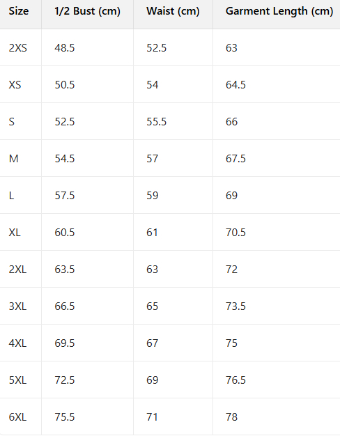 Sizes: 2XS, XS, S, M, L, XL, 2XL, 3XL, 4XL